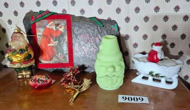 9009 Christmas decorations including Fenton fairy lamp, Westmoreland milk glass Santa on sleigh, glass or
