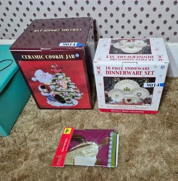 9014 Christmas dinnerware set in box, Santa cookie jar in box, gift bag