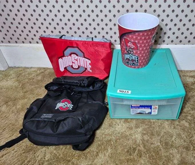 9015 Ohio State wrestling backpack, Ohio State insulated bag, Ohio State trash bin, storage drawer