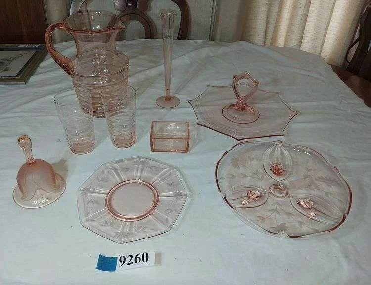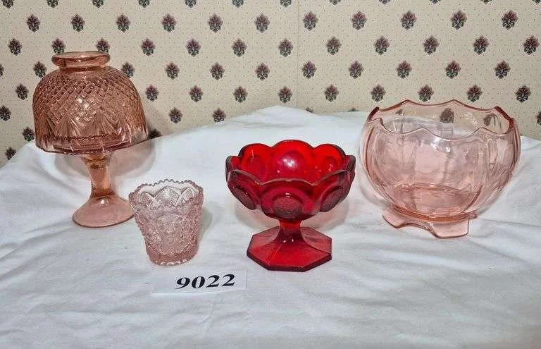 9022 Etched glass pink depression bowl, Ruby glass coin spot compote, pink Glass fairy lamp, pink toothpi
