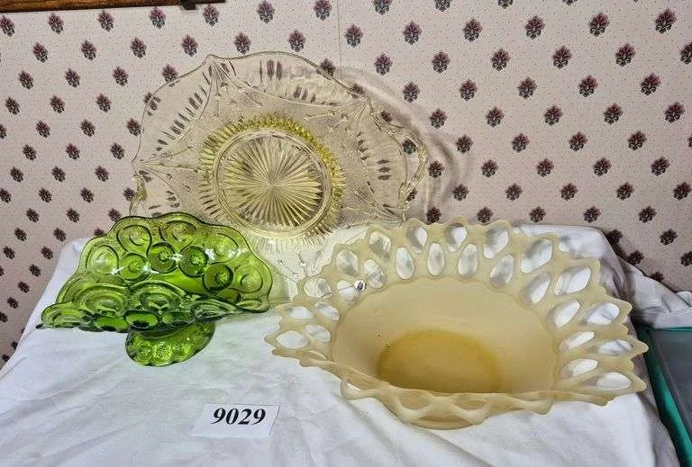 9029 Yellow depression glass plate, Westmoreland frosted yellow glass bowl, Green Glass banana/fruit dish