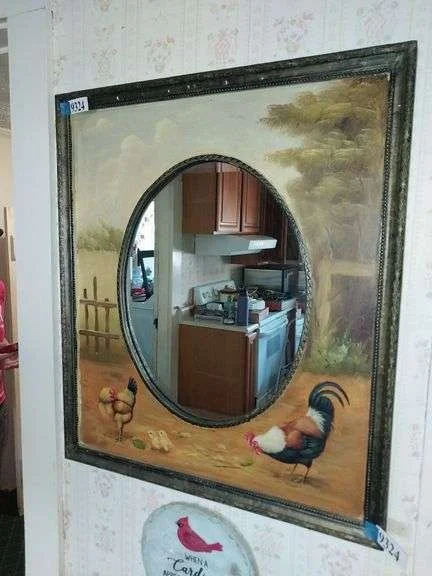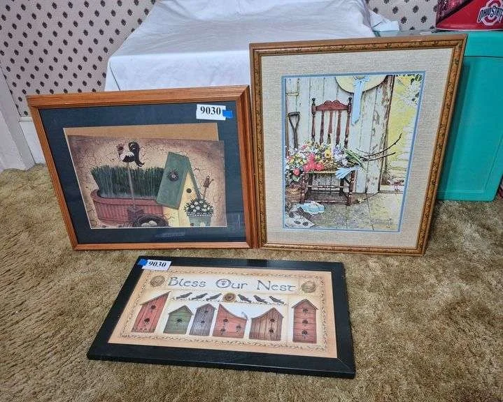9649 Framed grouse print, washboard, Lite beer sign, metal Last Supper wall hanging