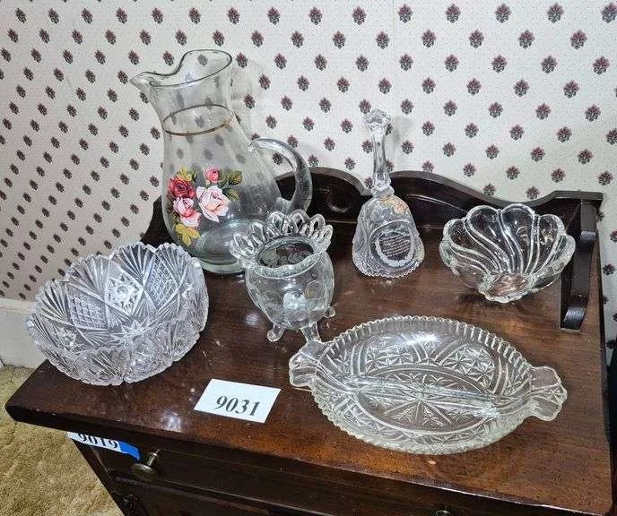 9031 Cut glass bowl, etched glass vase, Crystal bowl, painted glass pitcher, Etc