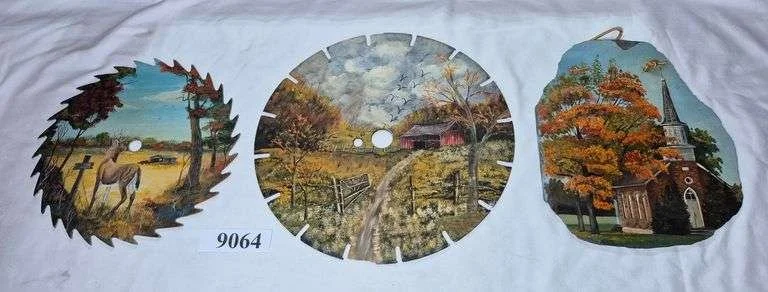 9064 Two hand-painted saw blades, and painted slate wall hanging