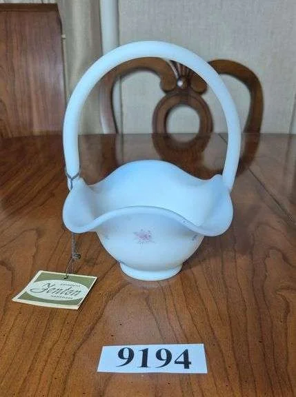 9033 Westmoreland milk glass covered dish with ivy painting, hobnail milk glass basket, milk glass vase