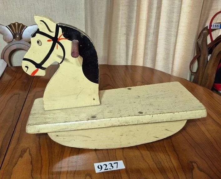 9651 Oak Chair / ironing board / step stool with heart cutouts, Antique wicker child's rocking chair, Vin