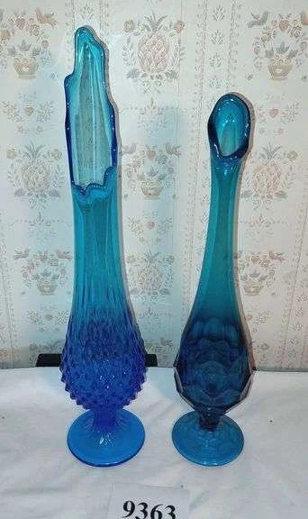 9607 Blue and green hobnail glass vases and ruffle edge bowl