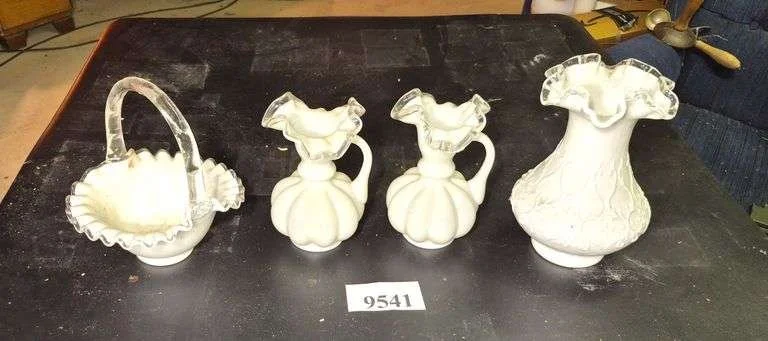 9648 Meito China tea set, glass basket, milk glass pitcher, marble cutting board, vases, liquor decanter,