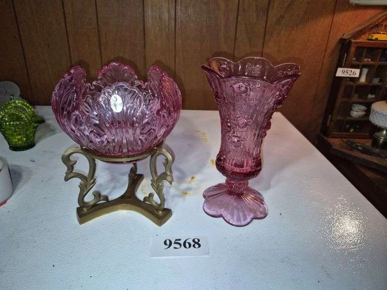 9026 Fenton pink case glass vase, Fenton pink hummingbird heart-shaped covered dish