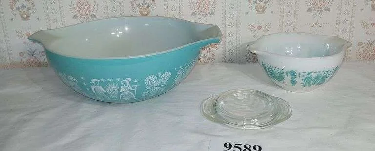 9575 Vintage Pyrex green Spring Blossom and pink Daisy baking dishes