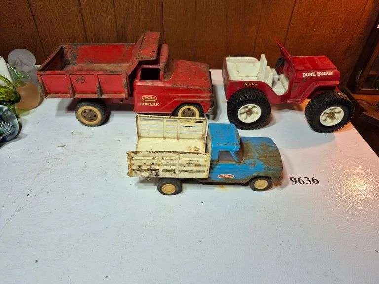 9636 Vintage Tonka hydraulic dump truck, Dune buggy, smaller stakebed dump truck