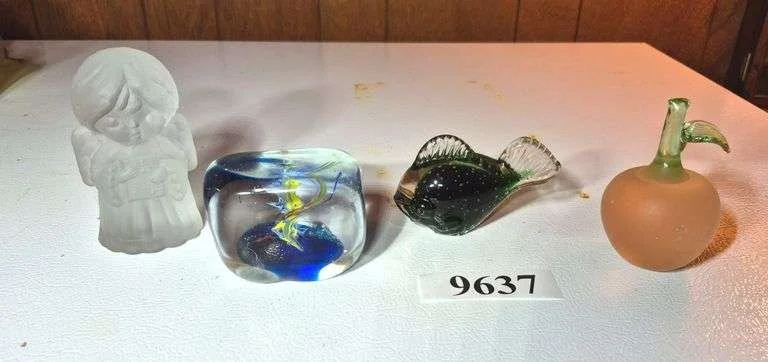 9637 Glass apple paperweight, two fish paperweights, frosted glass angel figurine