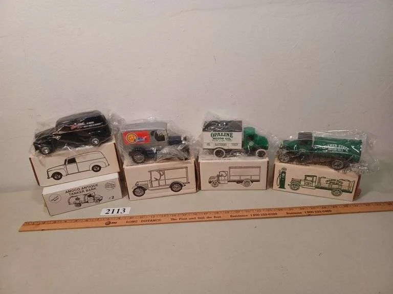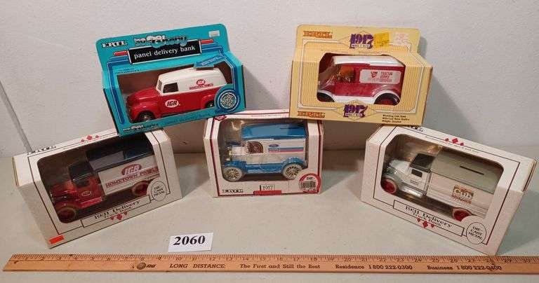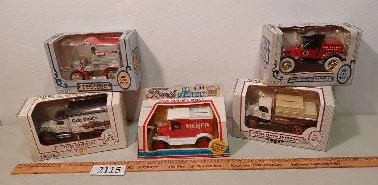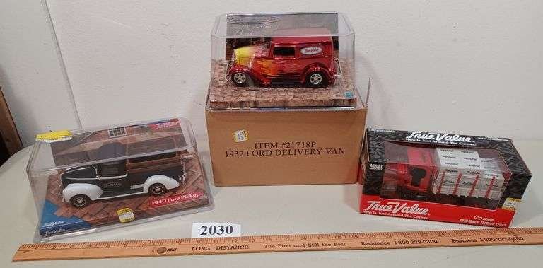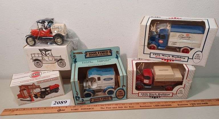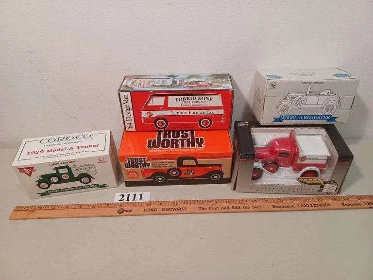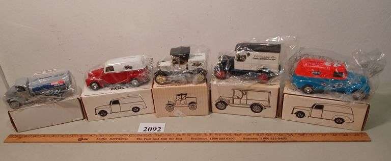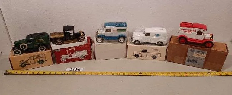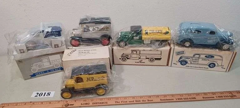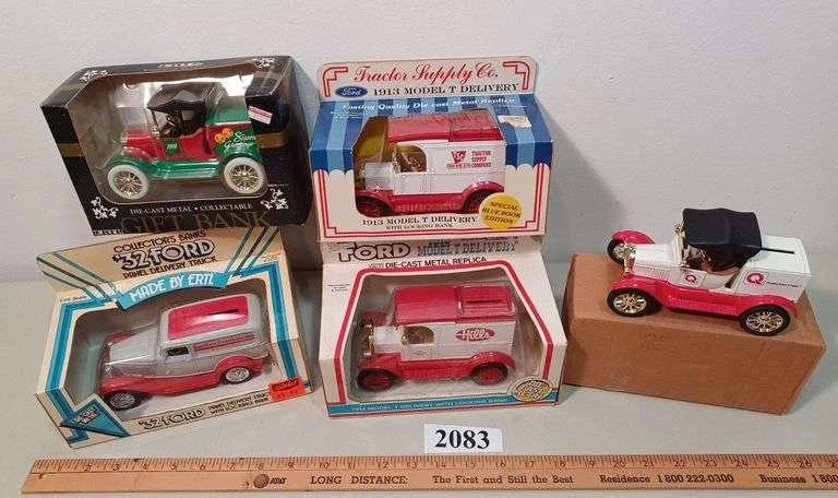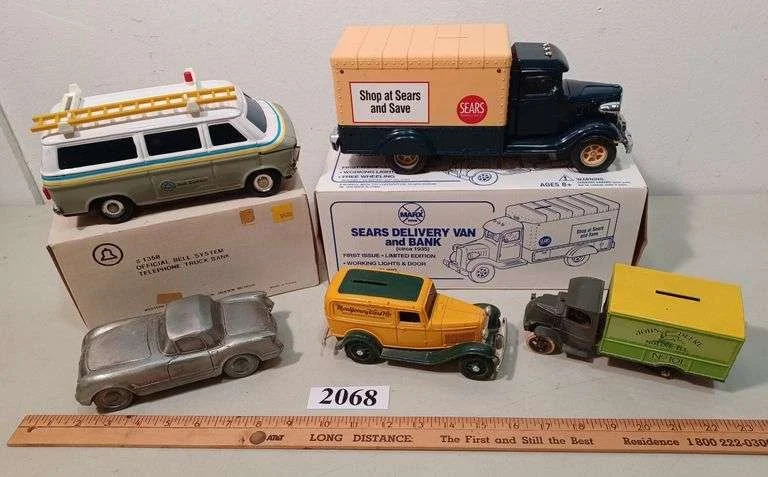 2068 Bell Telephone van, Sears delivery van, Montgomery Wards truck, John Deere truck, Mercedes Coupe banks.
