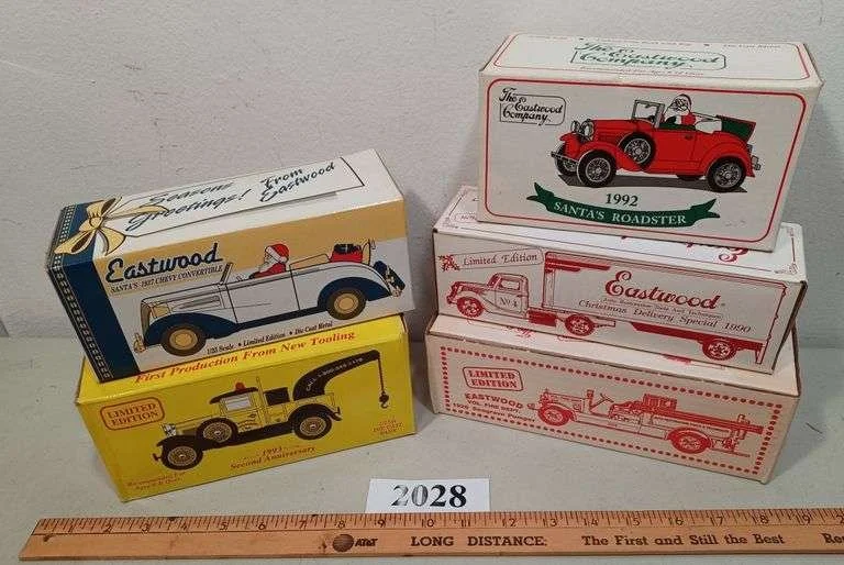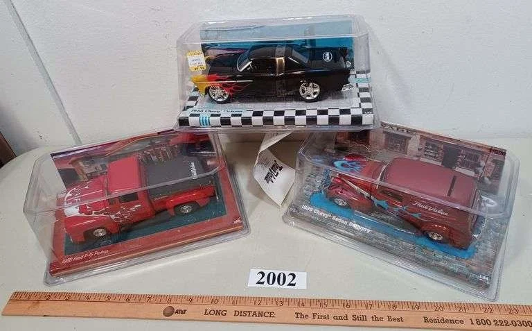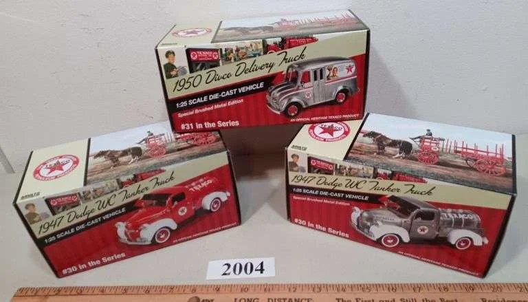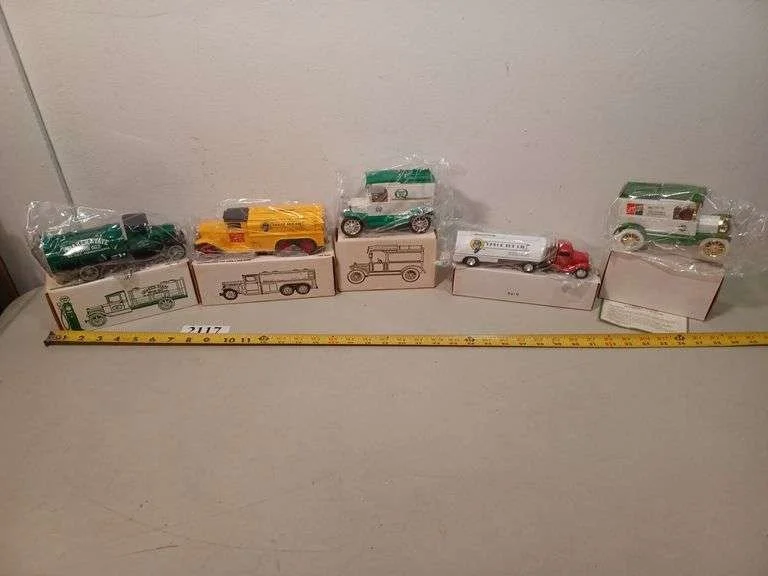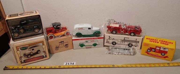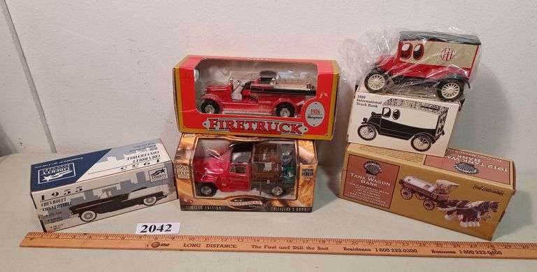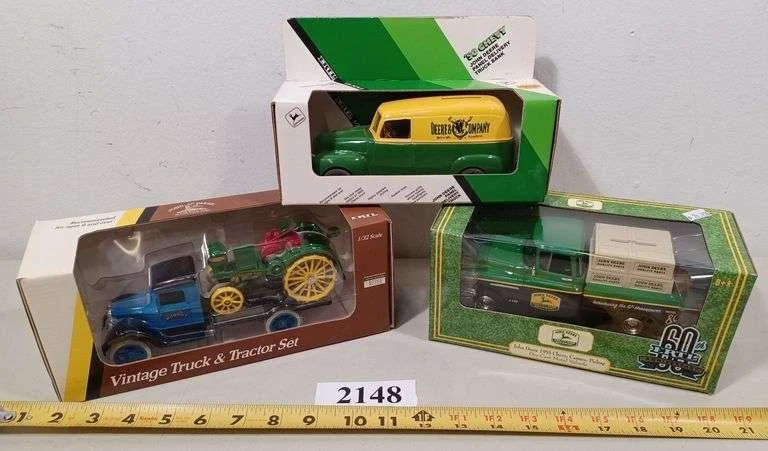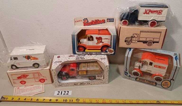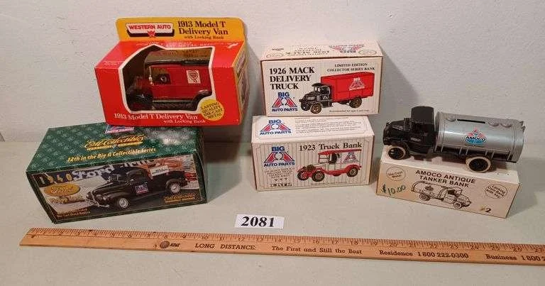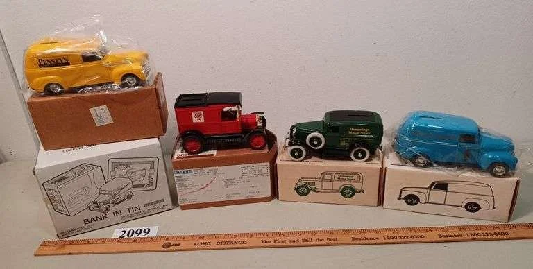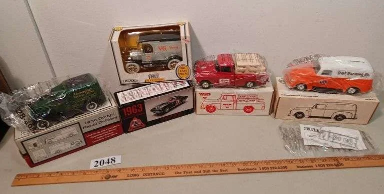 2068 Bell Telephone van, Sears delivery van, Montgomery Wards truck, John Deere truck, Mercedes Coupe banks.