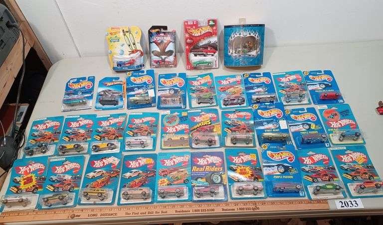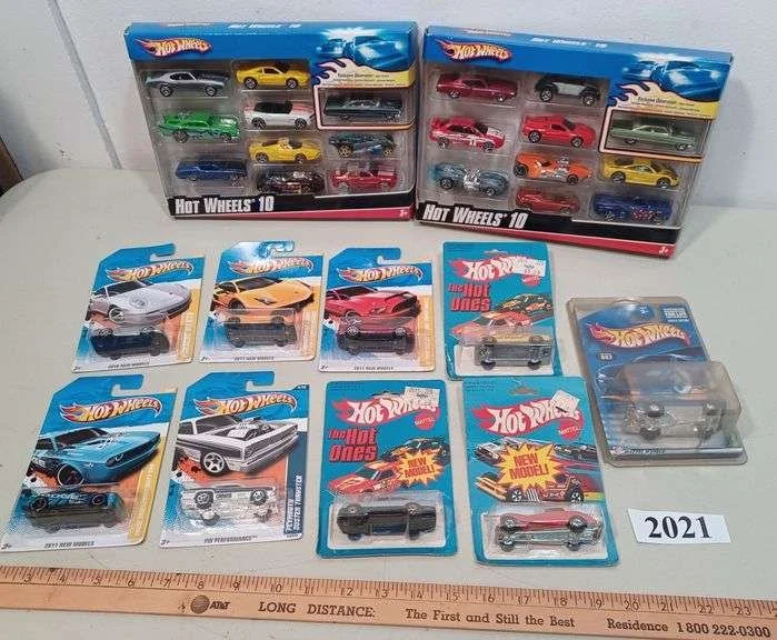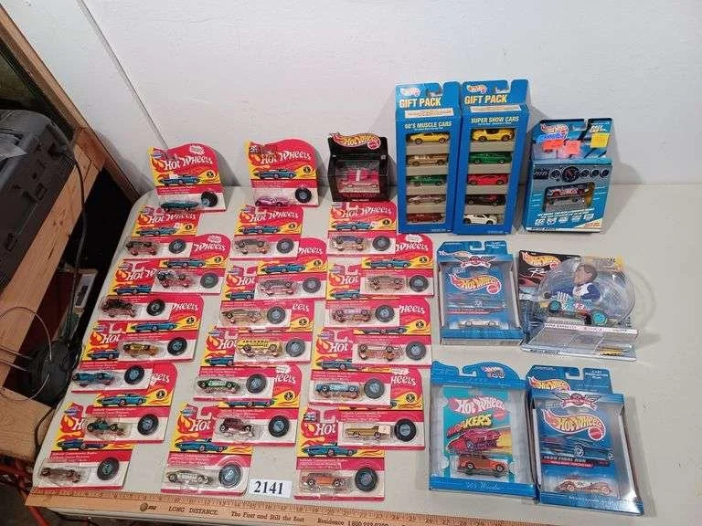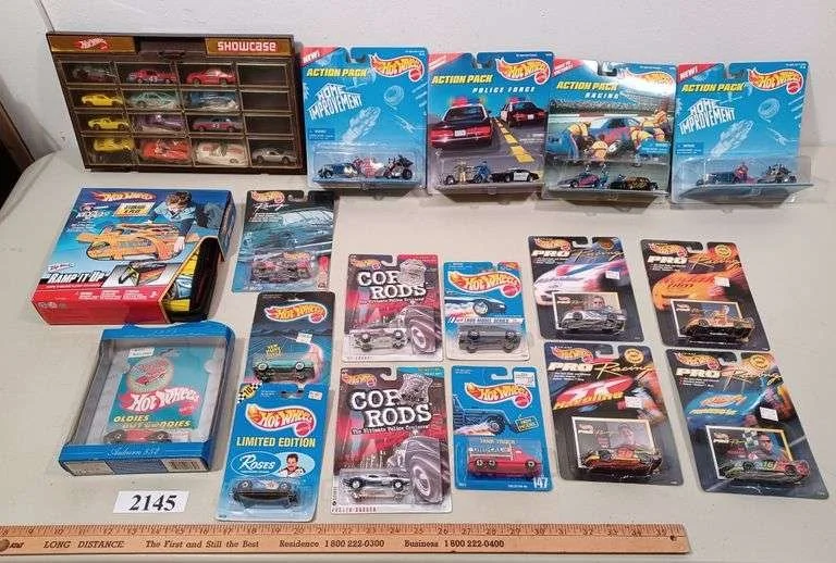 2145 Hot Wheels cars, car sets, storage and play set in packaging and showcase