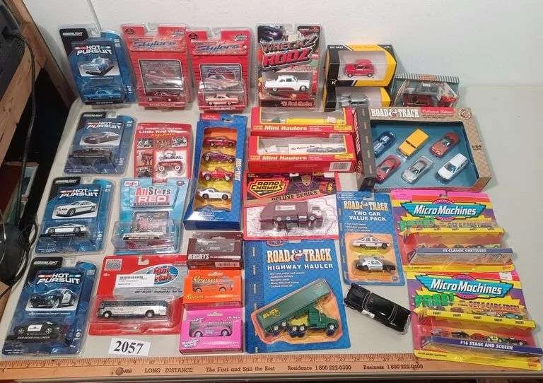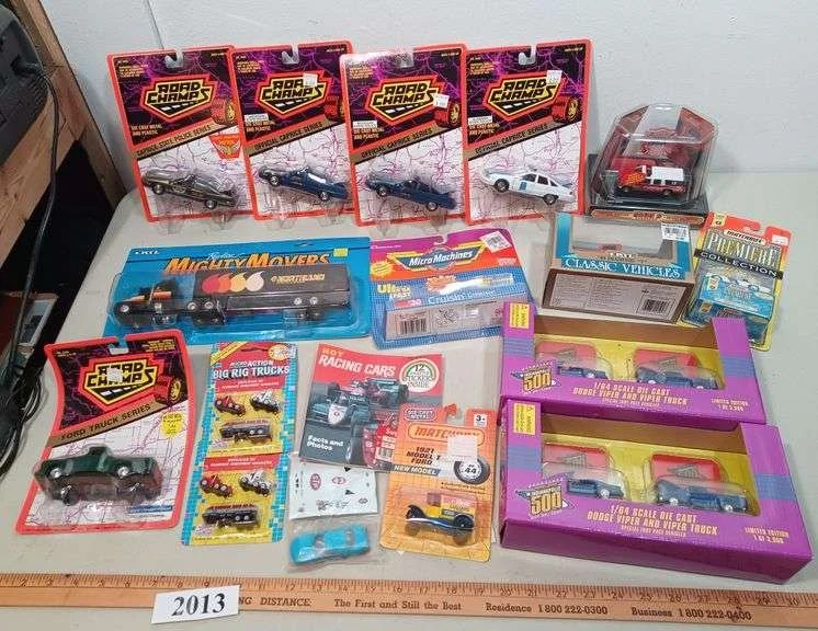 2057 Hot Pursuit, Road Champs, Micro Machines, and other cars, trucks, and sets in packaging