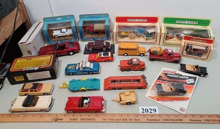 2029 ERTL, Corgi, and other slightly larger cars and trucks, some in packaging
