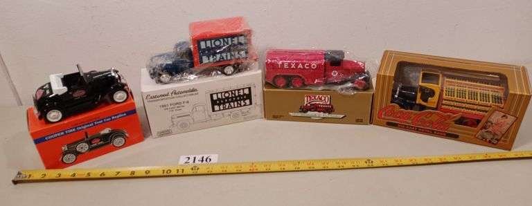 2146 (4) ERTL, Liberty, First Gear, and Coca-Cola die-cast truck banks in boxes
